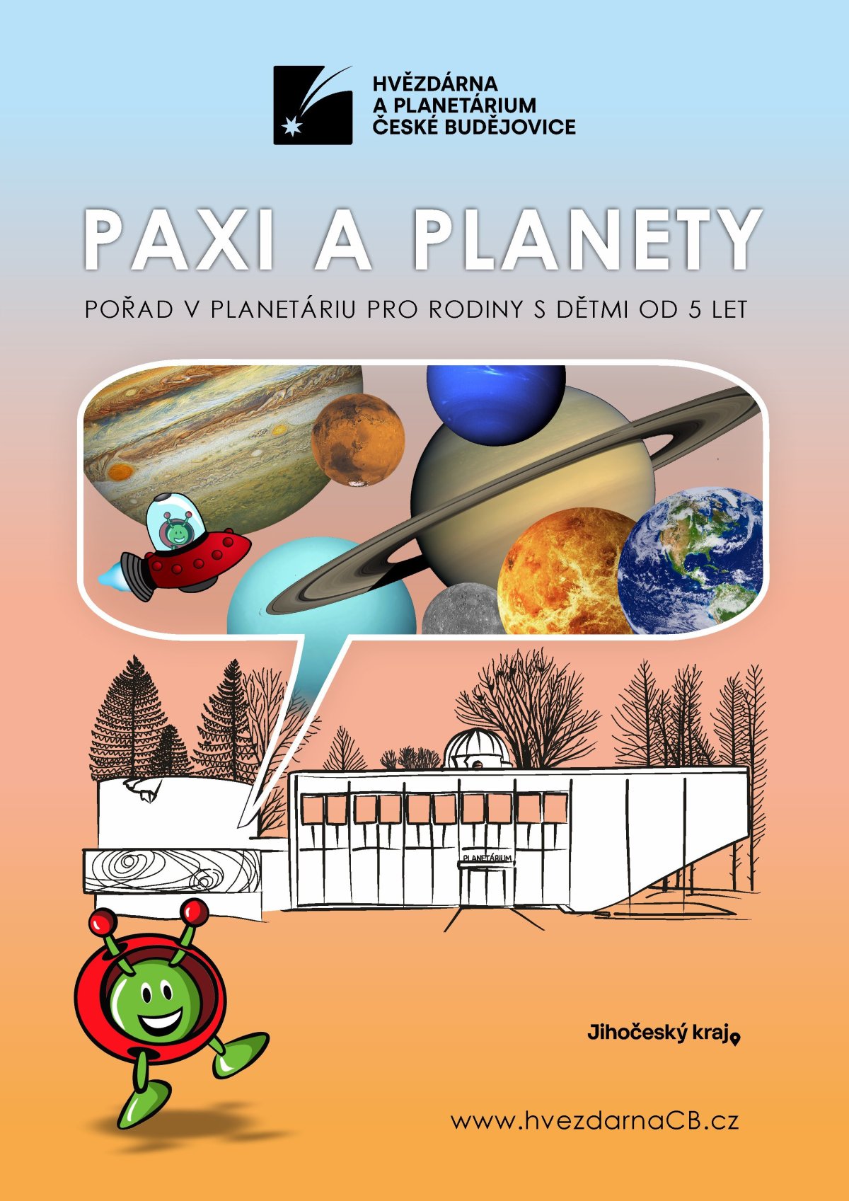 Paxi a planety - Chcete poznat planety? Pomůže nám s tím malý mimozemšťan Paxi. Délka pořadu cca 55 minut. Návštěvu planetária doporučujeme pro děti od 5 let.